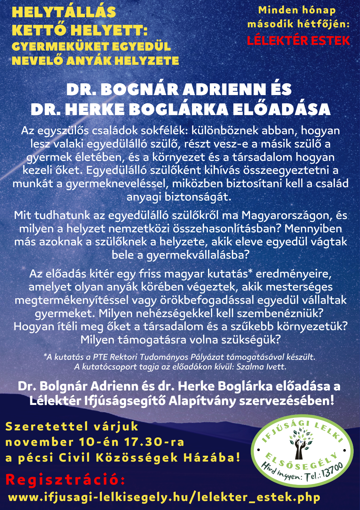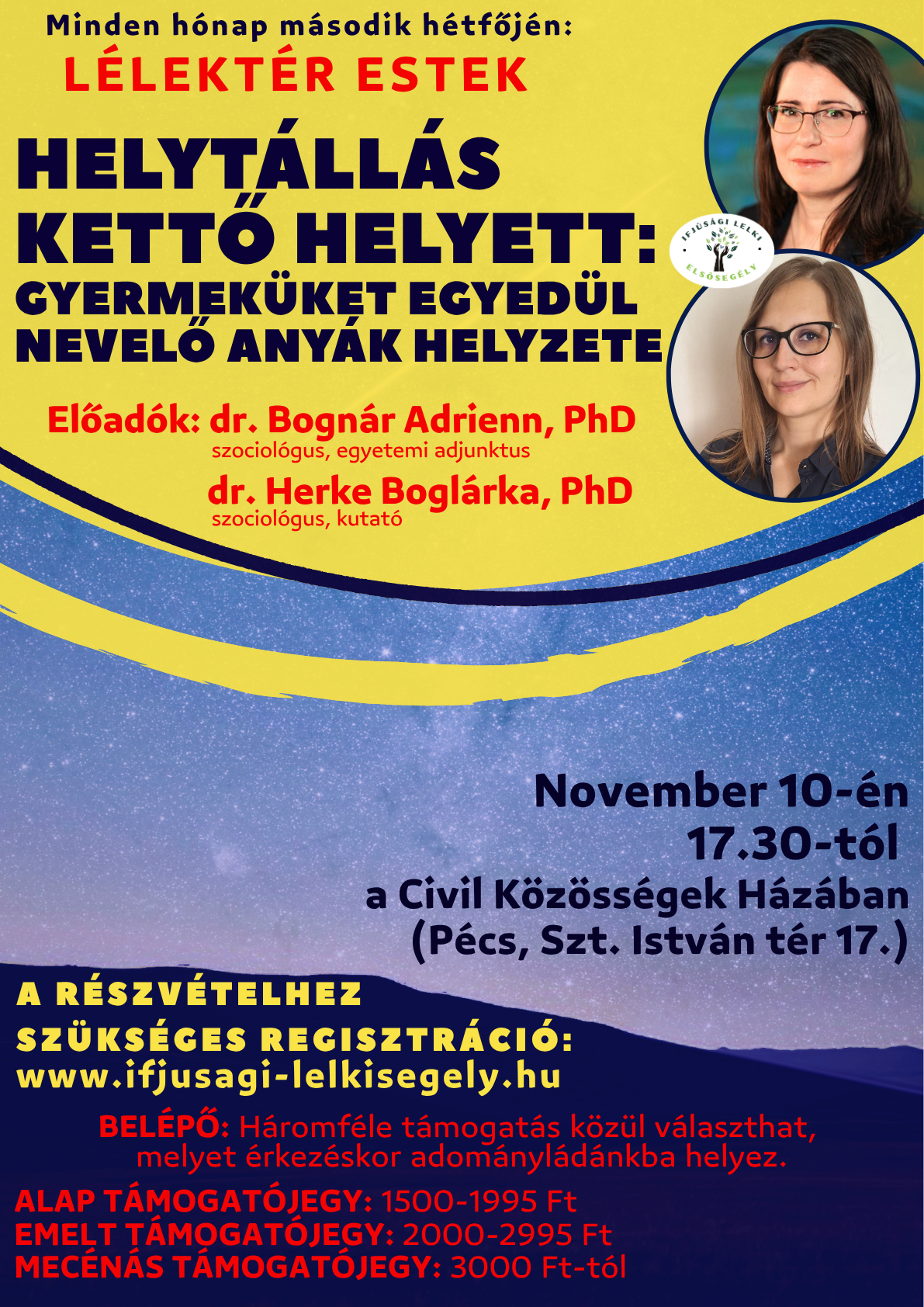 A következő Lélektér est november 10-én lesz a Civil Közösségek Házában, bárki érdeklődőt szeretettel várunk a középiskolásoktól a nyugdíjas korosztályig!